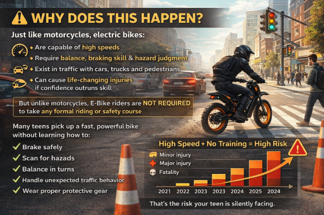 Electric bikes have exploded in popularity — especially among teenagers. But more bikes on the road also means more accidents, injuries, and even deaths.