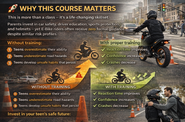 This is more than a class — it’s a life-changing skillset. Parents invest in car safety, driver education, sports protection, and helmets — yet E-Bike riders often receive zero formal guidance.